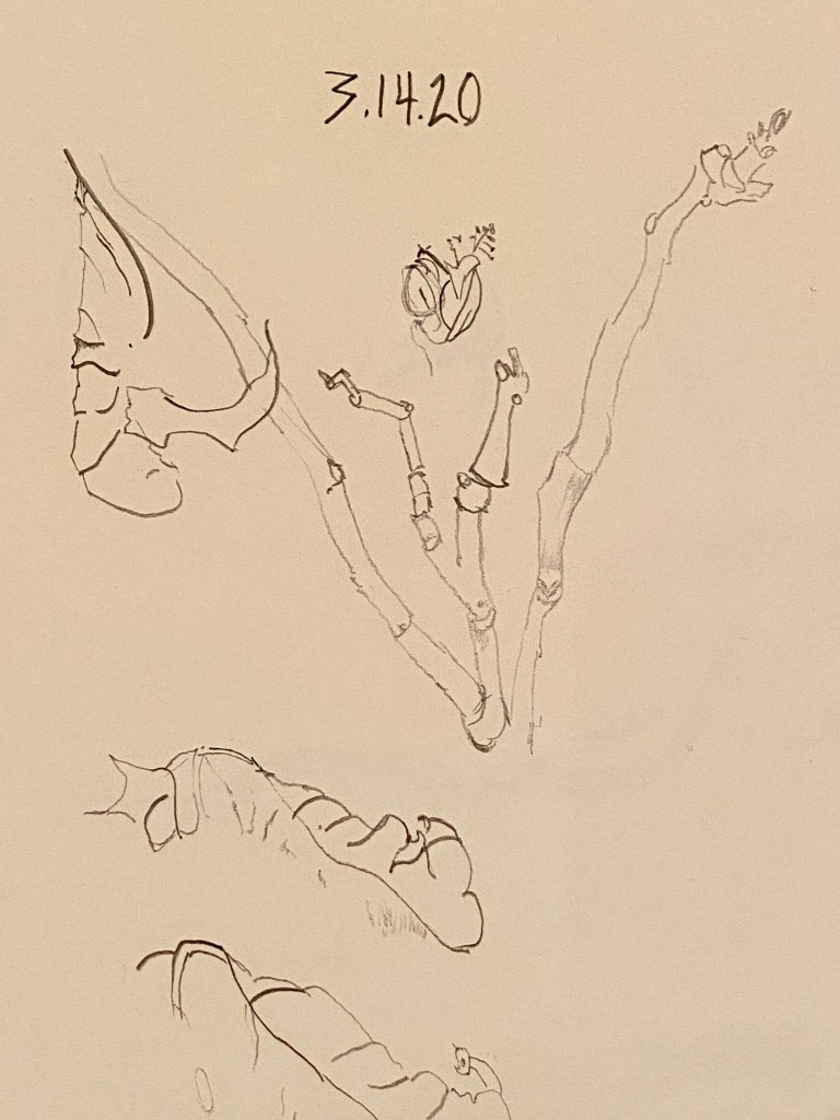Observed drawings, using living things as subjects, is a curriculum in design. A week into drawing, found living things around the house, my approach to breaking down what is being drawn transforms from creating outlines and copying lines to breaking down component parts. Observing how parts connect, hide one another and create shadows, that are visual parts which don’t exist, and are critical to the object as observed.